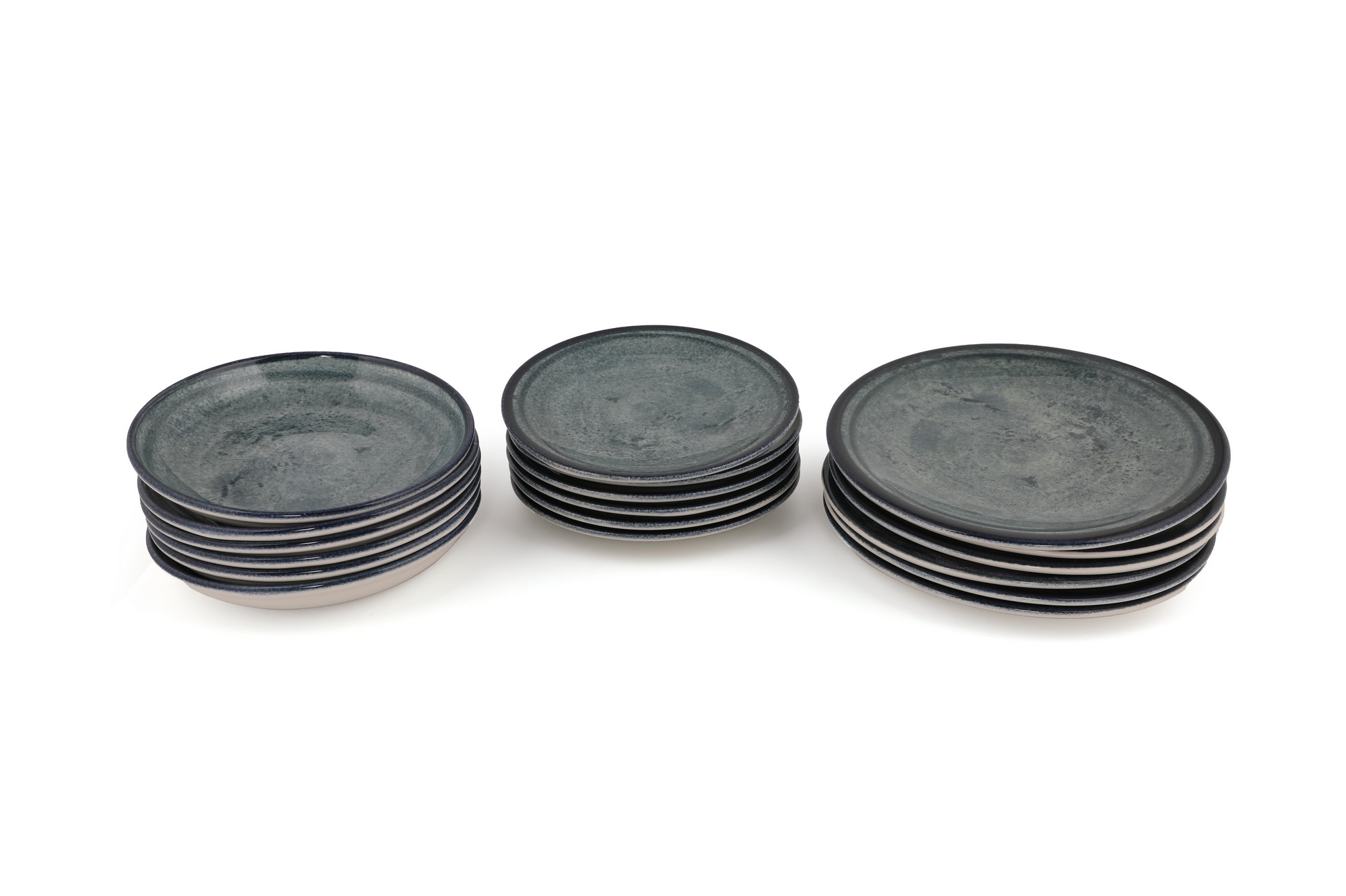 “100% NANO PORCELAN Servisni tanjuri: 25 x 25 x 2 cm (6 komada) Tanjuri: 21 x 21 x 4 cm (6 komada) Desertni tanjuri: 19 x 19 x 2 cm (6 komada)”