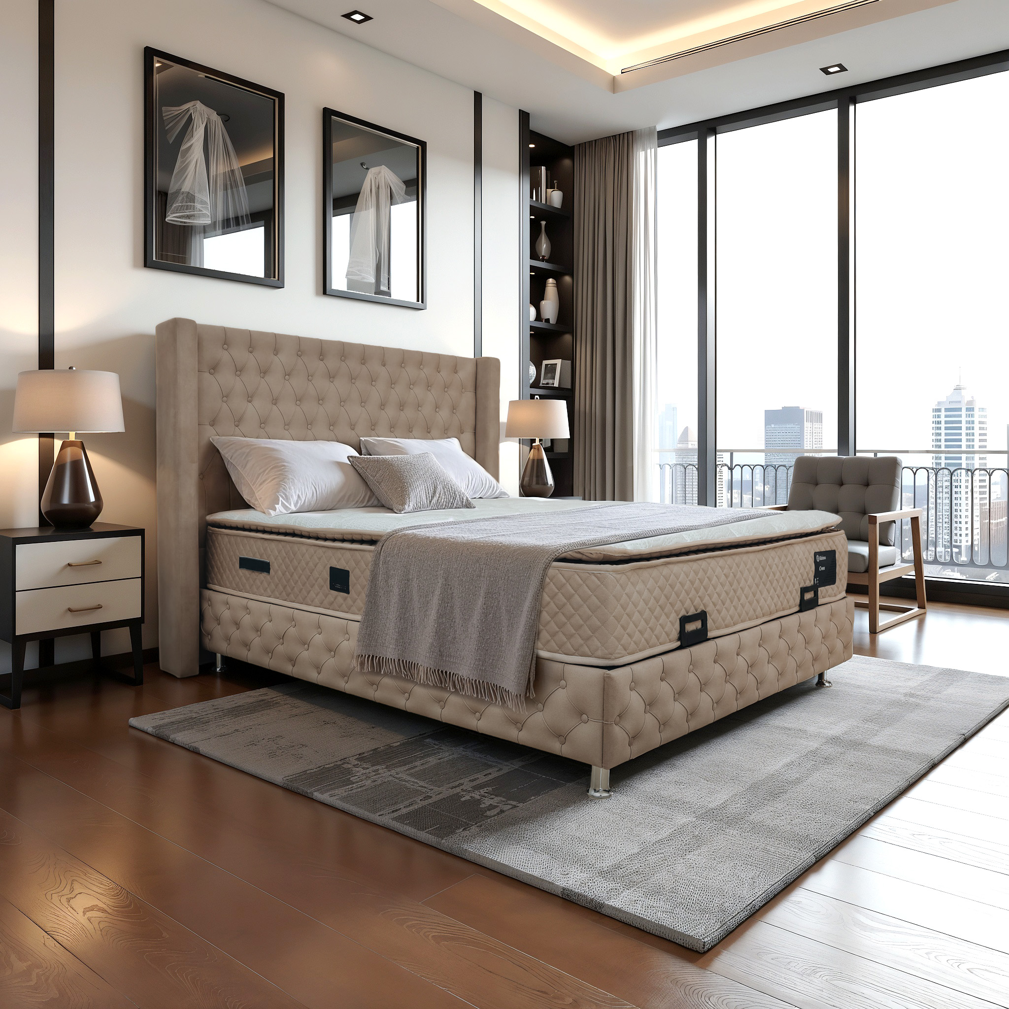 Boja madraca je usklađena s bazom kreveta, a prostrani sanduk nudi praktično rješenje za odlaganje stvari – sve u službi urednog i skladnog prostora.