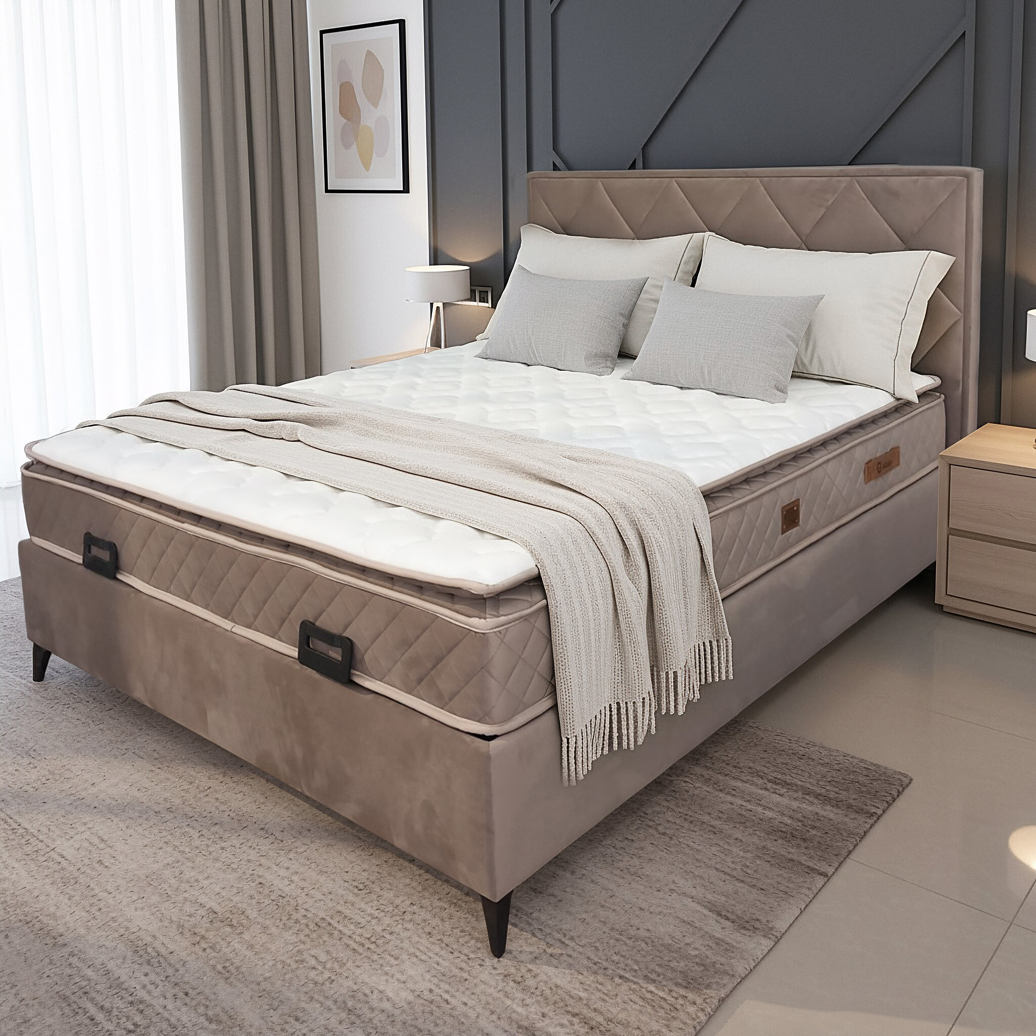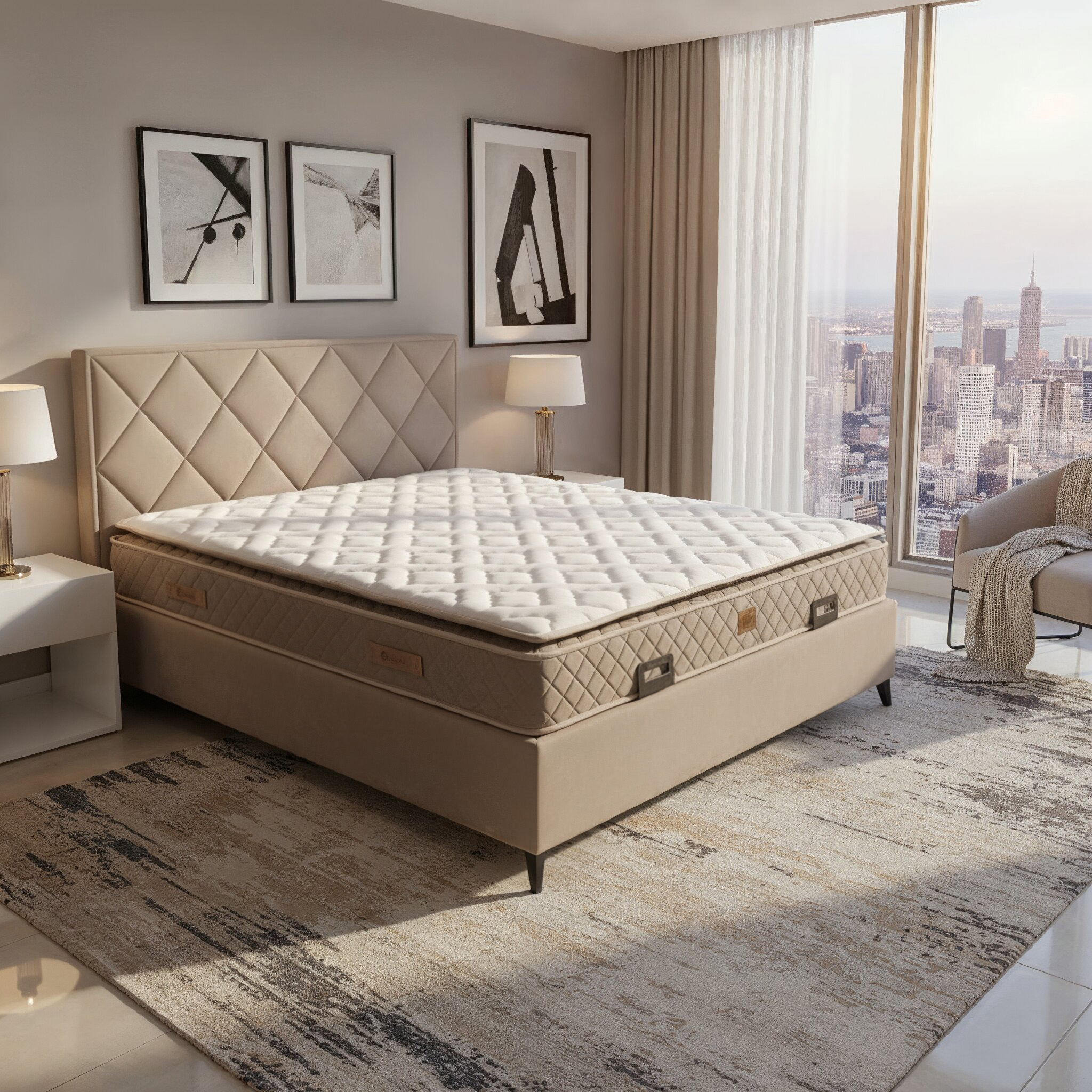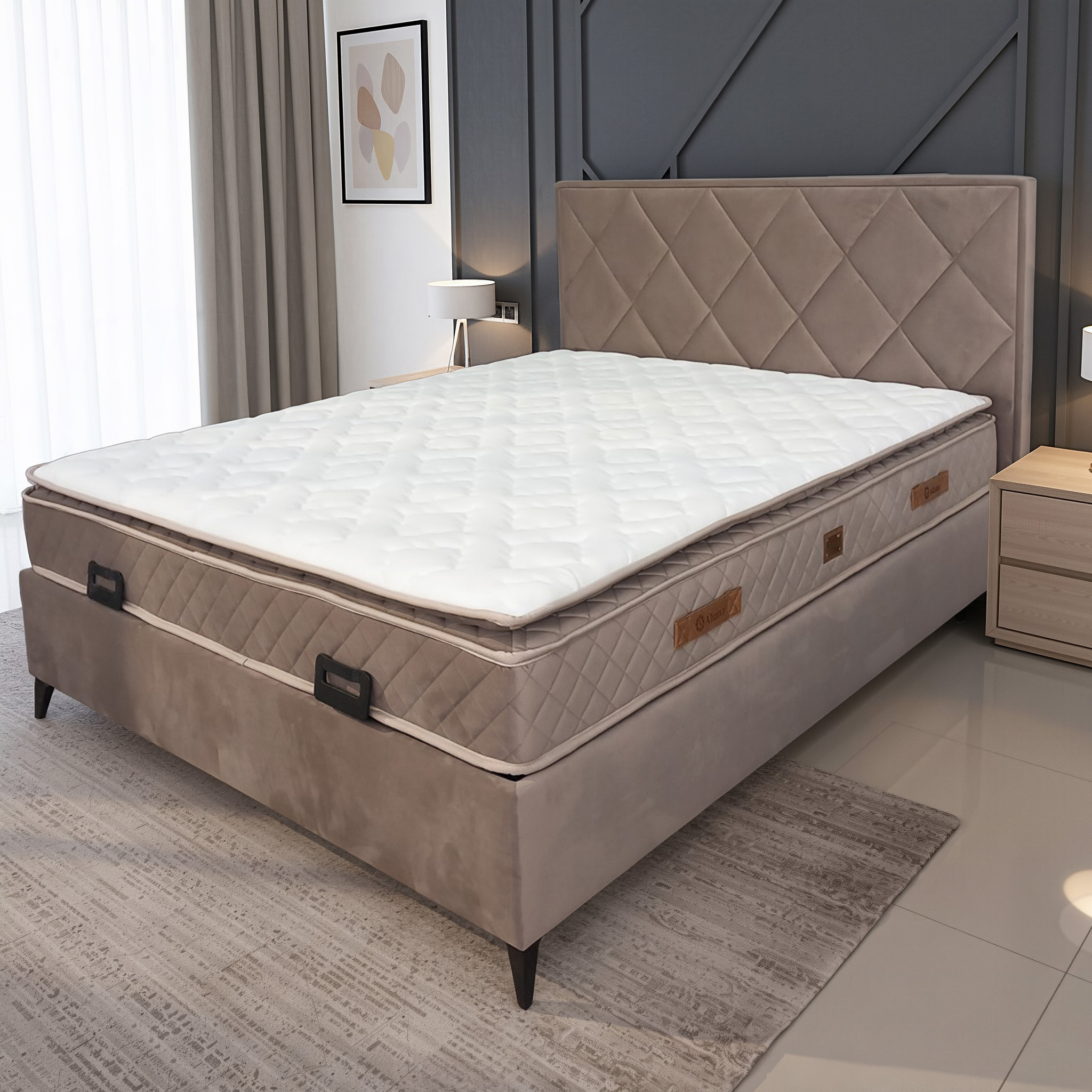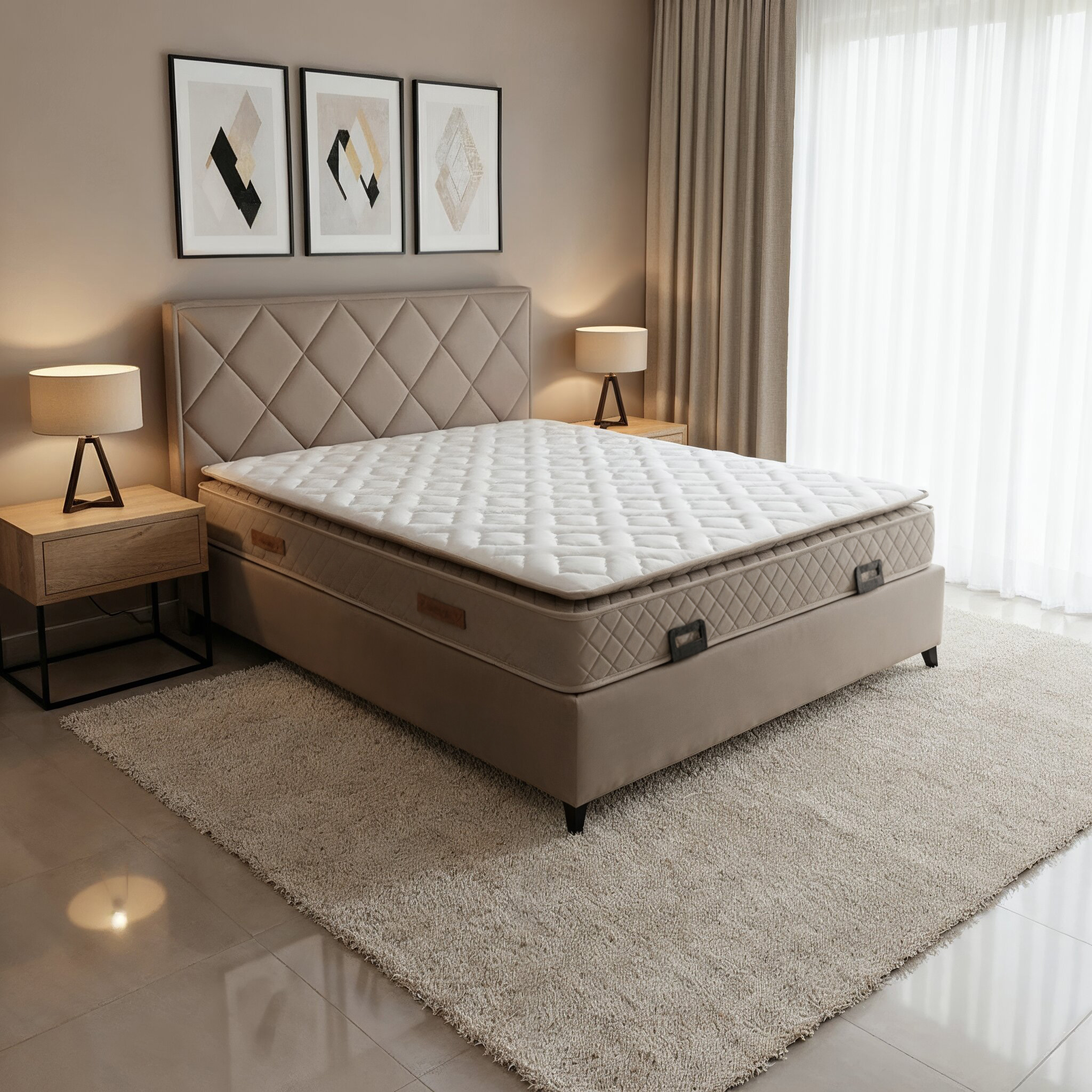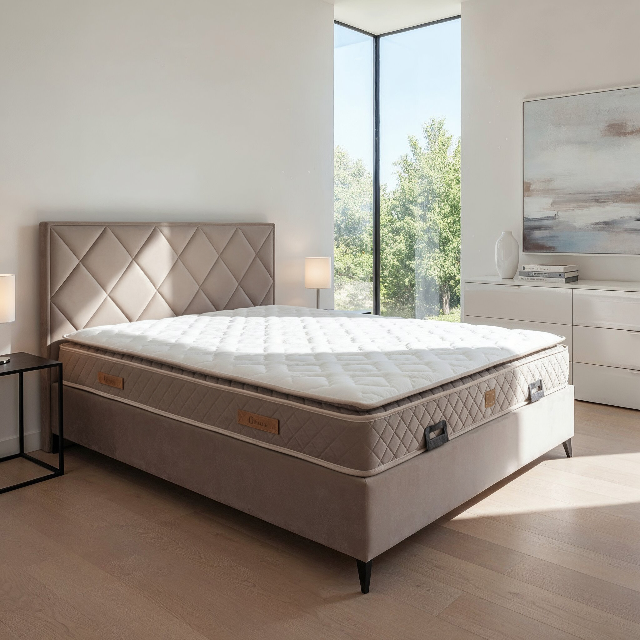 Madrac sa ušivenim nadmadracem izrađen je od bonel jezgra uz dodatne slojeve HR i Memory pjene, pružajući pravilan oslonac tijelu i osjećaj potpune udobnosti tokom sna. Antialergijska presvlaka doprinosi svježem i zdravom okruženju za odmor.